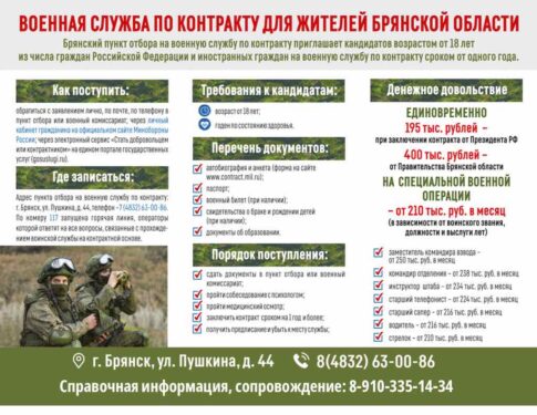 По вопросам поступления на контрактную службу можно обратиться в военный комиссариат по месту жительства или по адресу: г. Брянск, ул. Пушкина, д. 44, тел. 8-910-335-14-34, 63-00-86.