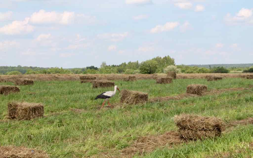 На прессах, перевозке и погрузке сена было задействовано 15 единиц техники. Скошенную стерню уже облюбовал аист в поисках пропитания.