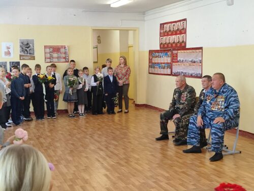 В линейке приняли участие ученики 5 и 6 классов и педагоги, а также 1-ая знамённая группа школьного армейского отряда.