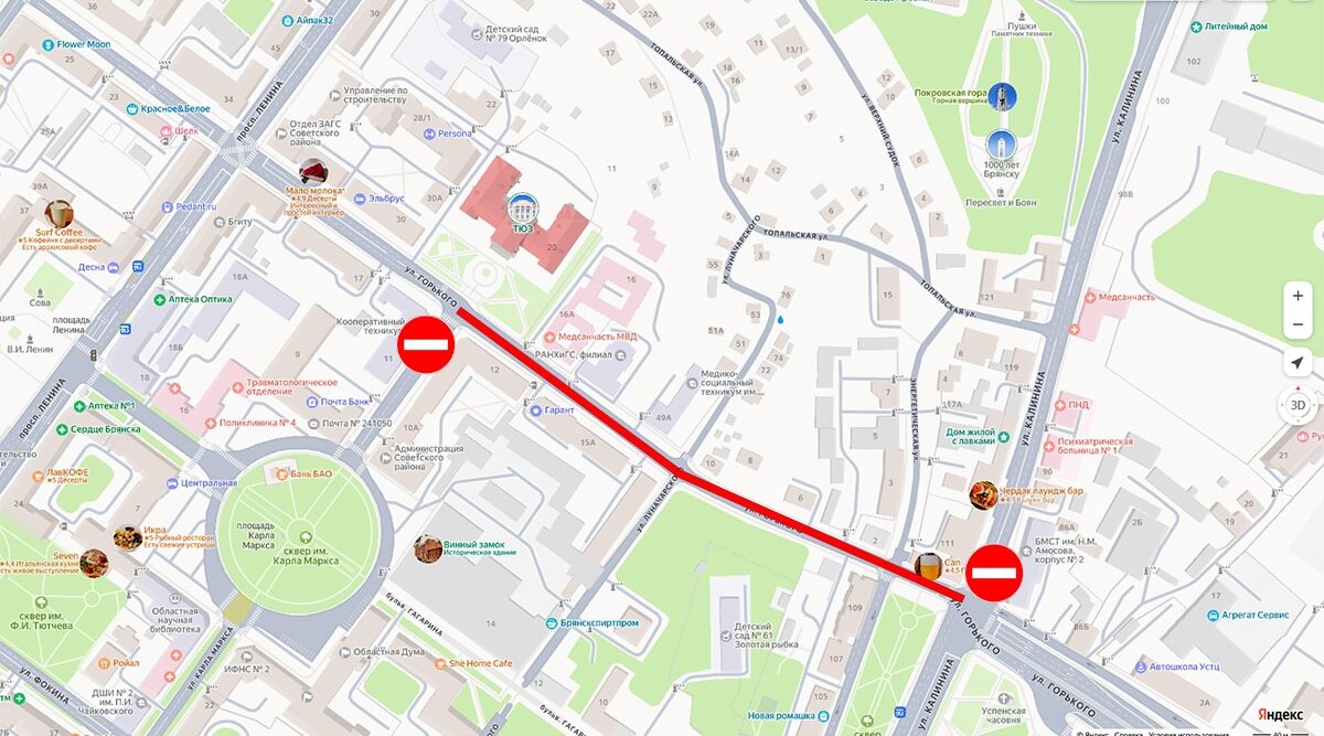 Так, с 30 до 19 октября будет закрыто движение транспорта по улице Горького в Брянске. Речь идёт об участке от улицы К. Маркса до улицы Калинина. Ограничение движения связано с капитальным ремонтом улицы Горького. А 30 сентября и 1 октября будет перекрыто движение транспорта по 2-му проезду Станке Димитрова на участке от дома № 11 по 2-му проезду Станке Димитрова до улицы Костычева. Ограничение связано с предстоящим асфальтированием проезжей части.