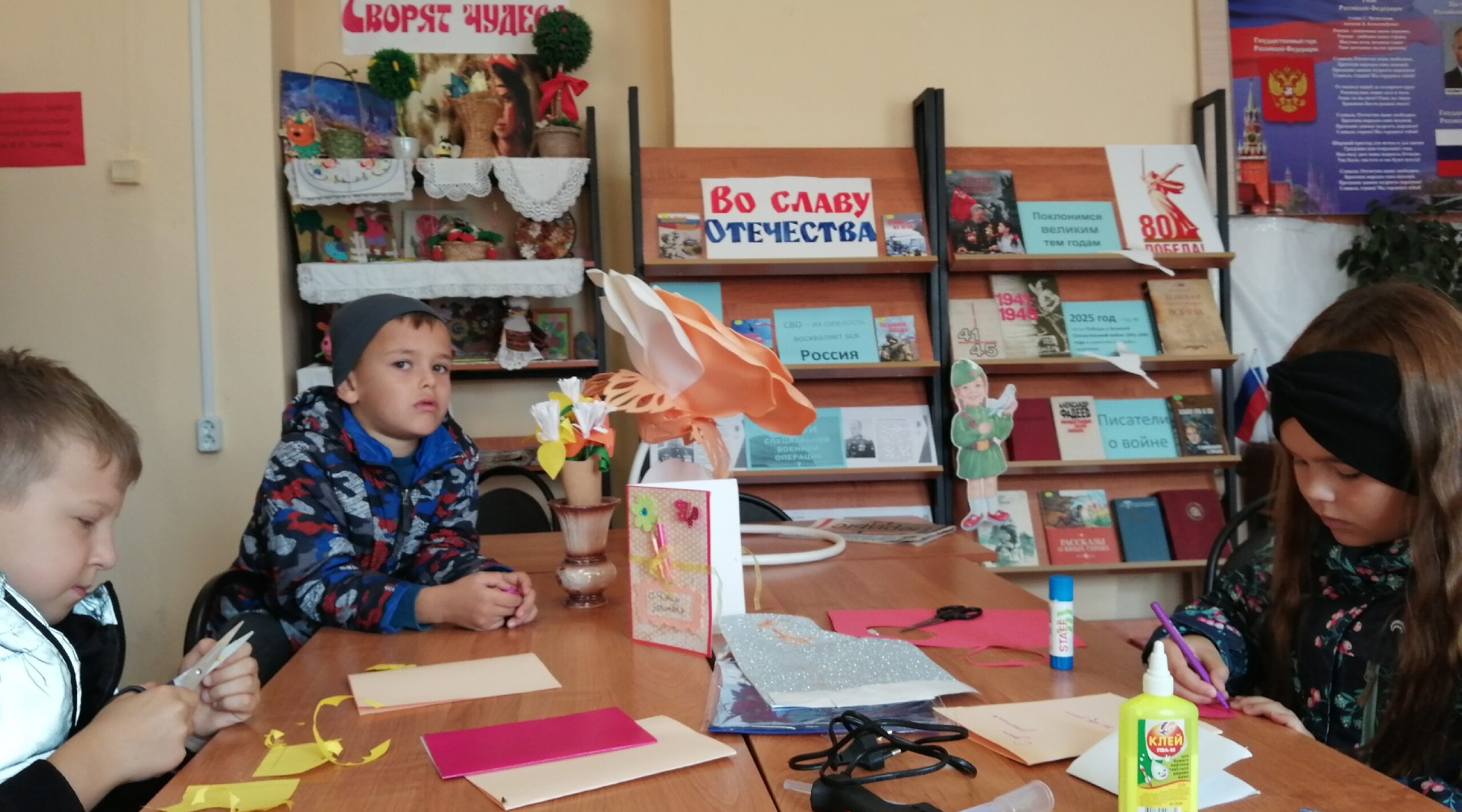 Школьники с большим удовольствием окунулись в творческий процесс. Они старательно и аккуратно вырезали и приклеивали каждый элемент изготовляемой ими открытки из цветной бумаги и картона. Аппликации получились яркими, красочными, а пожелания самыми искренними и добрыми.
