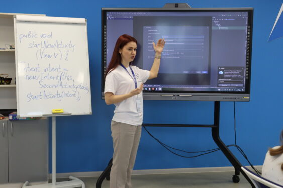 11 ноября двери «АЙТИ-куба» распахнулись для учеников средней школы № 35. Для них была организована профессиональная проба по направлению «Разработчик мобильных приложений». Елена Маркелова познакомила школьников с основами языка программирования Java и средой разработки Android Studio. В ходе занятия ребята смогли создать свой первый экран для мобильного приложения – интерактивную викторину с вопросами и вариантами ответов. Это стало отличным первым шагом для тех, кто мечтает создавать приложения, которыми ежедневно пользуются миллионы людей по всему миру.