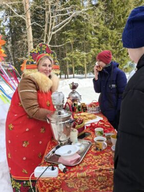 В конце мероприятия все участники с удовольствием приступили к традиционному чаепитию на свежем воздухе с вкуснейшими блинами, баранками и конфетами. Праздник прошёл в тёплой дружеской атмосфере, подарив всем положительные эмоции и заряд бодрости.