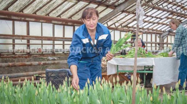 С 10 февраля в теплицах подняли температуру, обильный полив дал толчок бурному росту, и сейчас наступила пора срезки. Срезанные тюльпаны укладывают на хранение в холодный погреб, где они ждут покупателей.