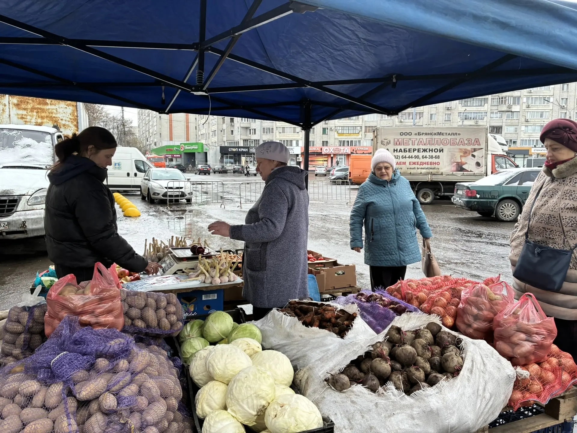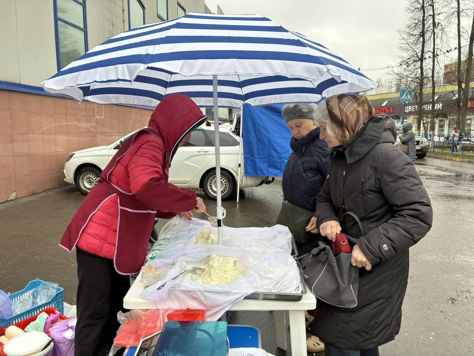 Даже плохая погода не испортила настроения ни фермерам, ни покупателям. Горожане спешат на ставшую привычной торговую площадку.