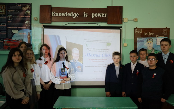 В ходе мероприятия состоялась защита презентации «Поэзия СВО» по творчеству офицера Н.В. Самойлова в рамках проекта «Поэтическая Брянщина «Опаленные войной. 41-24″». Учащиеся 6 «Б» класса совместно с библиотекарями подготовили сценарий для защиты, отыскали ценную информацию о жизни и творчестве славного сына Отечества и, конечно, достойно представили ее.